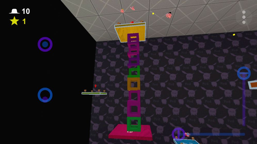 > 尾迹模式,可以在三维空间中自由绘画。通过射击其他戴着有颜色帽子的小飞猪可以改变尾迹的颜色。