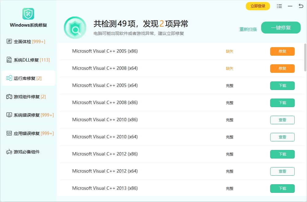 一键智能识别并修复系统DLL缺失、游戏无法运行等问题。软件适用于多种操作系统,产品还支持VC运行库修复、Net Framework修复等功能。该工具提供了智能匹配和自动修复功能,可自动识别和修复运行库中的问题,为用户提供更加便捷的修复体验,并且下载并替换损坏或丢失的DirectX运行库组件,恢复其正常的功能和稳定性。